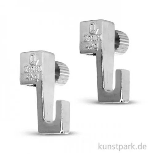 Zwei Haken zur Aufhängung von Bildern im Artiteq Click Rail System. Die Haken können mit Hilfe einer Feststellschraube auf der gewünschten Höhe fixiert werden.