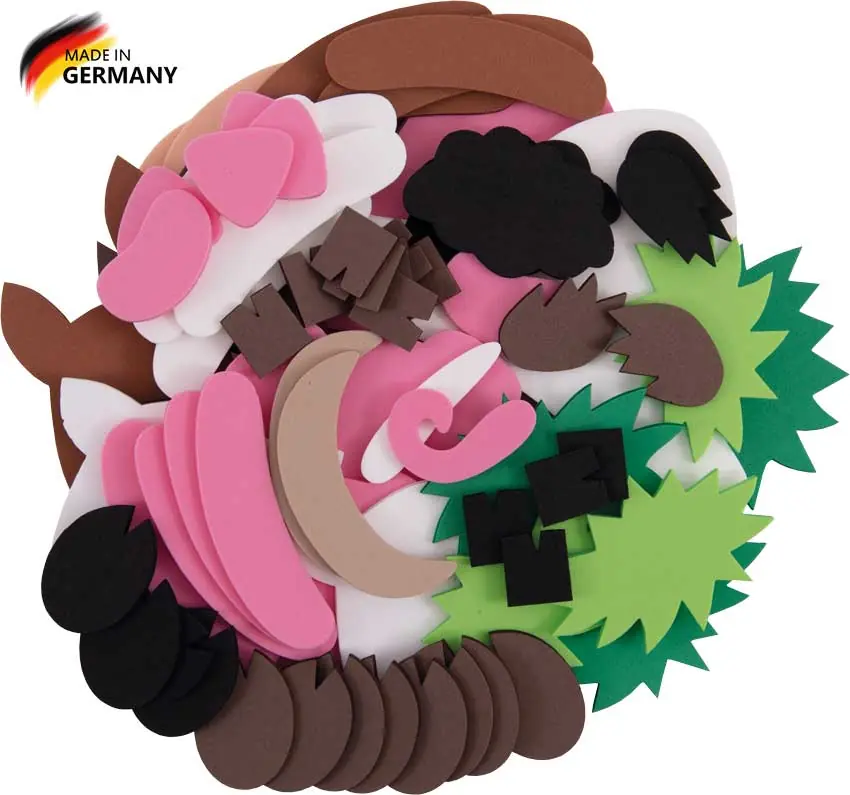 Bauernhoftiere76-teilig, aus MoosgummiMit Tipps zum Gestalten! Einfach mit schwarzem Permanentmarker und weißem Acrylmarker verzieren.