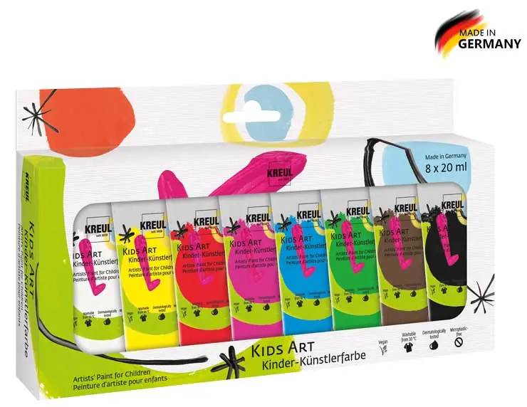 Kids Art Kinder Künstlerfarbenset8 x 20 mlHochpigmentierte Kinder Künstlerfarbe, ab 30°C aus den meisten Textilien auswaschbar, parabenfrei, vegan, mikroplastikfrei (ausgenommen fluoreszierende Farben), dermatologisch getestet, auf Wasserbasis, farbinte…