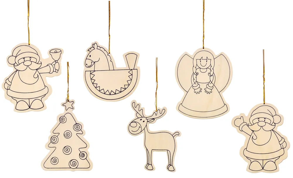 Start » Kunst & Basteln » Limited Edition Weihnachtsanhänger 6er-Set aus Sperrholz mit Goldfaden