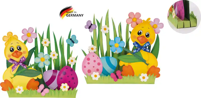 Kreativpaket 3D-Dekobild KükenMaterial ausreichend für 6 StückInhalt: 18 Grundkörper Dekobild, Fotokarton sortiert, Glitterkarton sortiert, 2m Satinband Blumen sortiert, inkl. Anleitung und SchnittbogenGesamthöhe 21,5cm