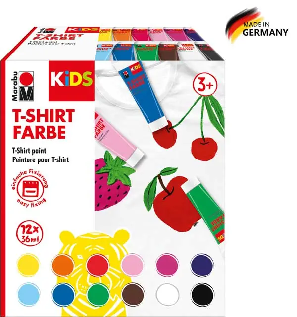 T-Shirt Farbenset Kids12 x 36 ml sortiertDie brillanten und leuchtkräftigen Farbtöne der T-Shirt Farbe sind ideal zum Gestalten von hellen Stoffen geeignet (bis max. 20% Kunstfaseranteil).Die dickflüssige Farbe lässt sich leicht vermalen und die Farbtöne…