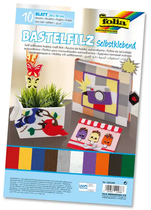 Weltweiter Versand Bastelfilz 150g/m², selbstklebend 20x30cm, 10 Blatt, farbig sortiert